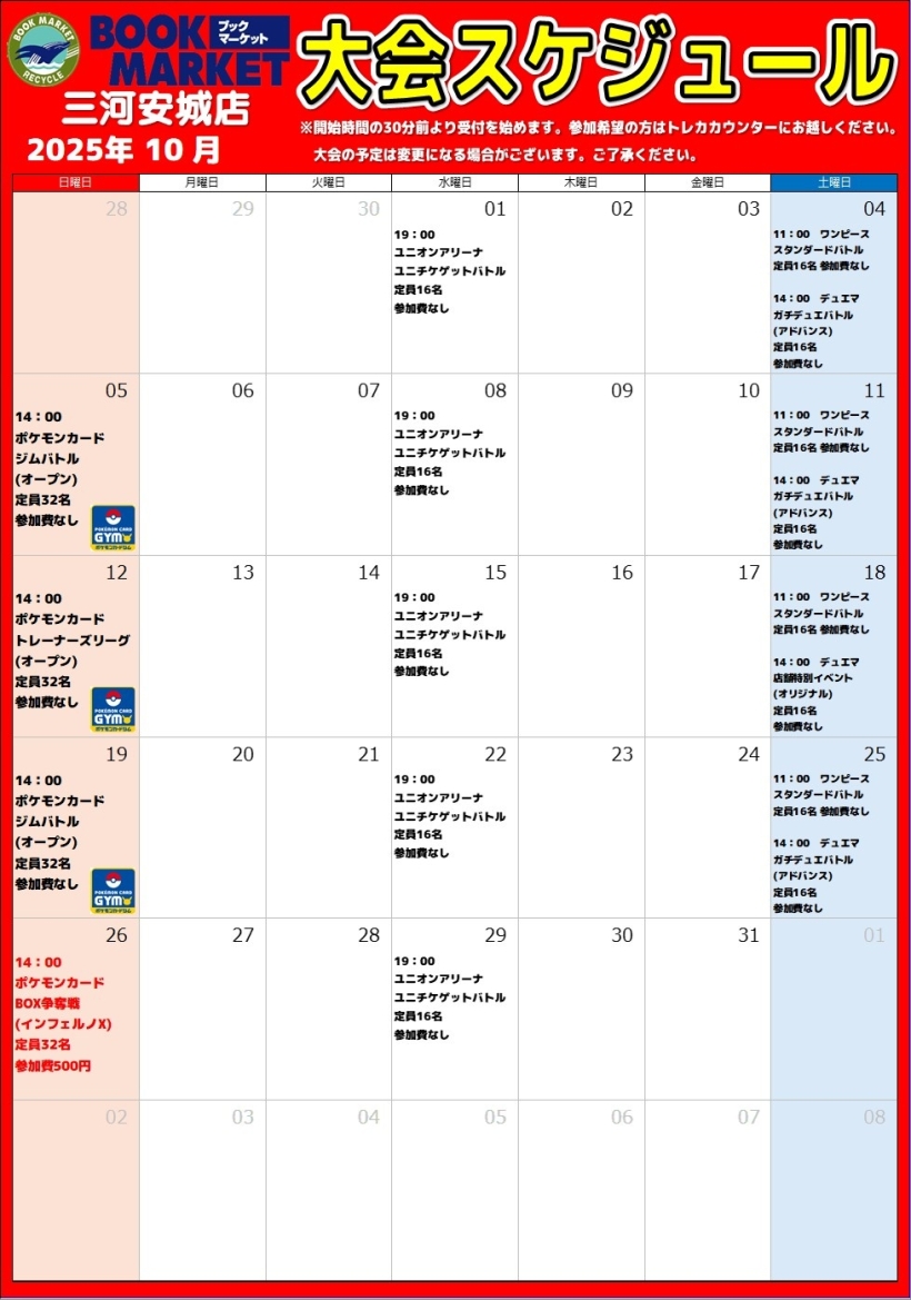 【2025年10月】TCG大会スケジュール【BMA三河安城店】