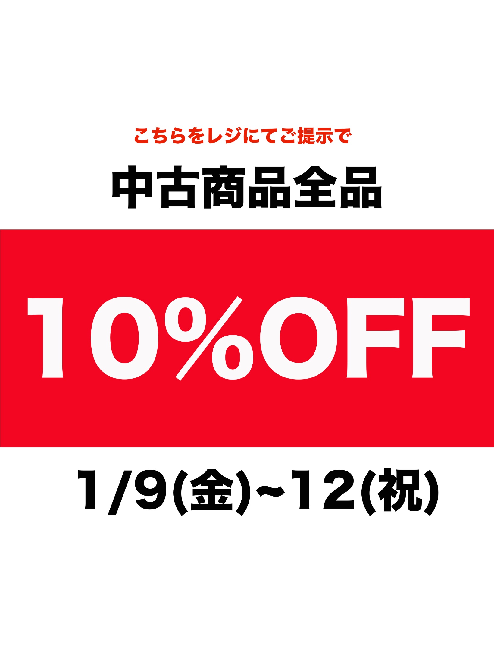 1月9日(金)〜12日(祝)なんと↓こちら↓のページをレジにてご提示いただくと、中古商品全品10%OFF