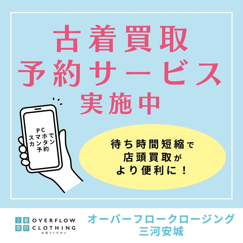 ※アパレル買取は大変混み合っております。下記の画像をクリックしていただき、ご予約いただくとスムーズに承ることができます。「買取予約サービス」ぜひご利用ください。