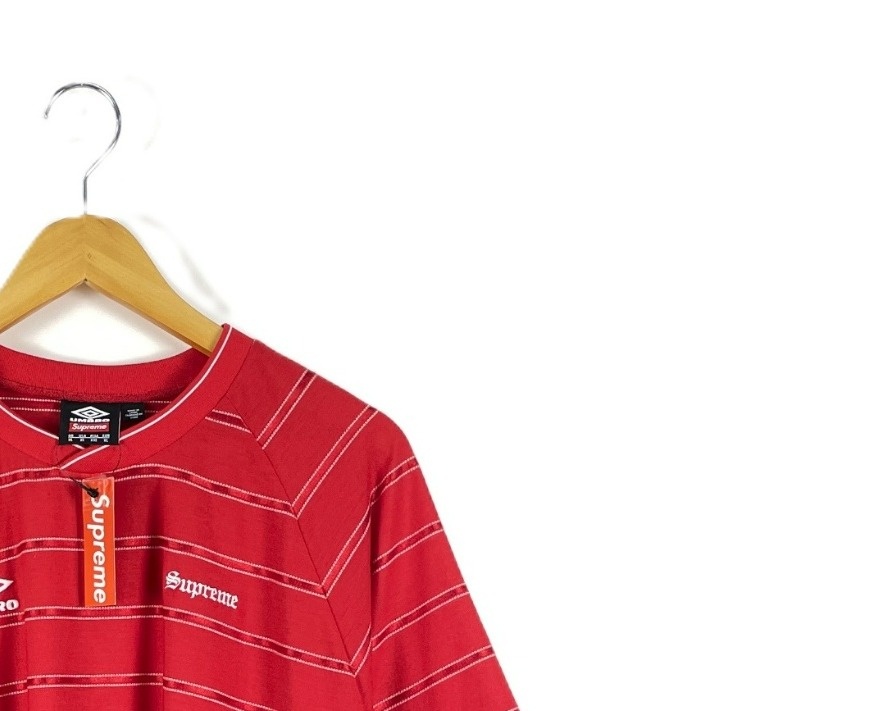 【入荷】SUPREME×UMBRO 25/SS Tシャツ XLサイズ 別注モデル STRIPE SOCCER JERSEY ストライプ柄 RED/WHITE