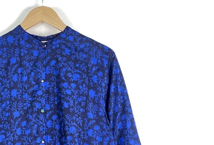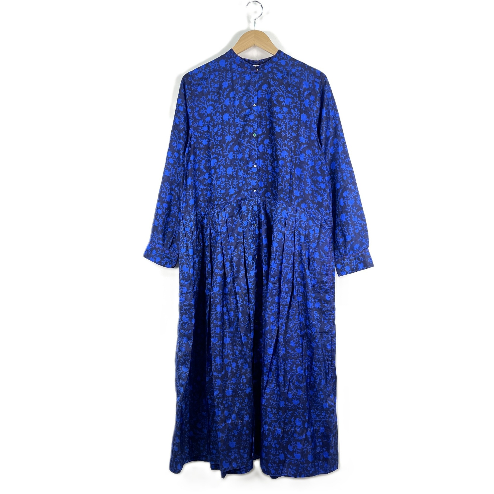 【入荷】INJIRI 25/SS 25-040-450-0016-1-0 ワンピース Mサイズ SILK NO COLLAR L/S DRESS 総柄 BLUE/NAVY