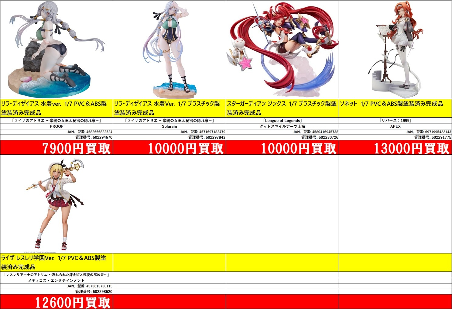 掲載価格は完品美品の買取価格です。品物の状態、在庫状況や市場価格によって買取価格は変動します。掲載アイテムはあらかじめ分けてお持ち込みください。