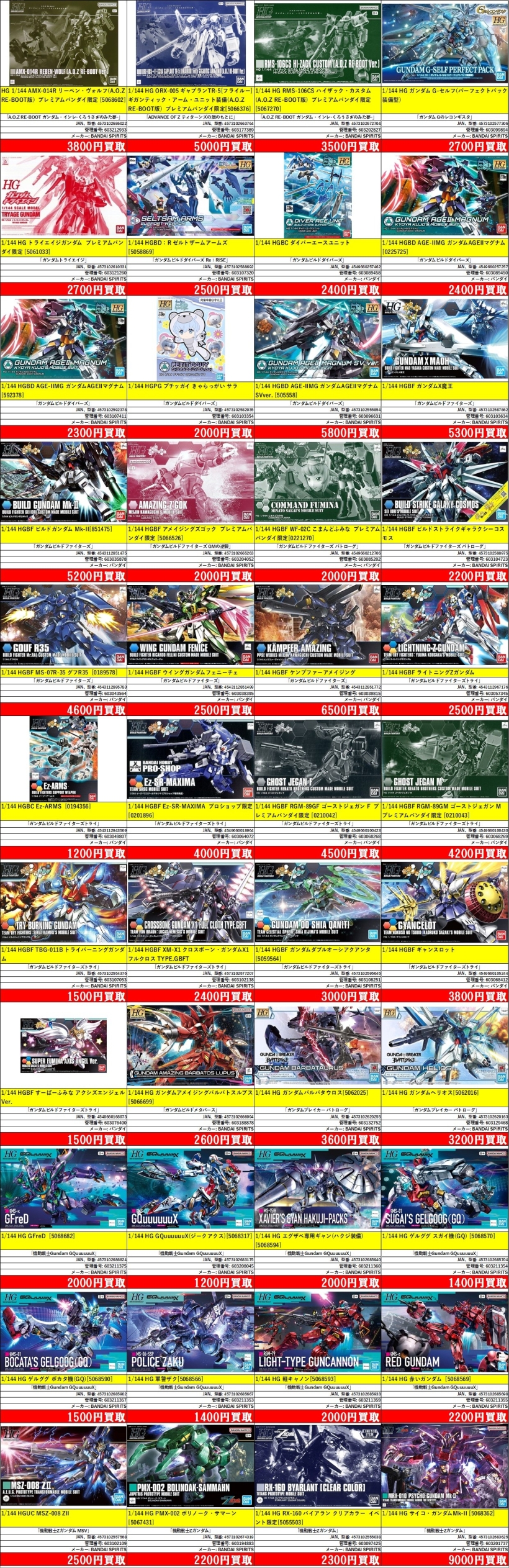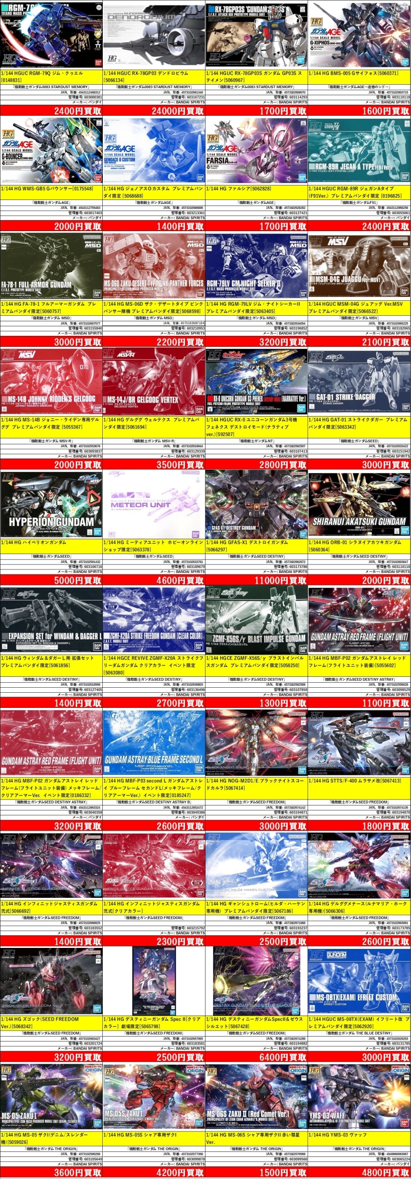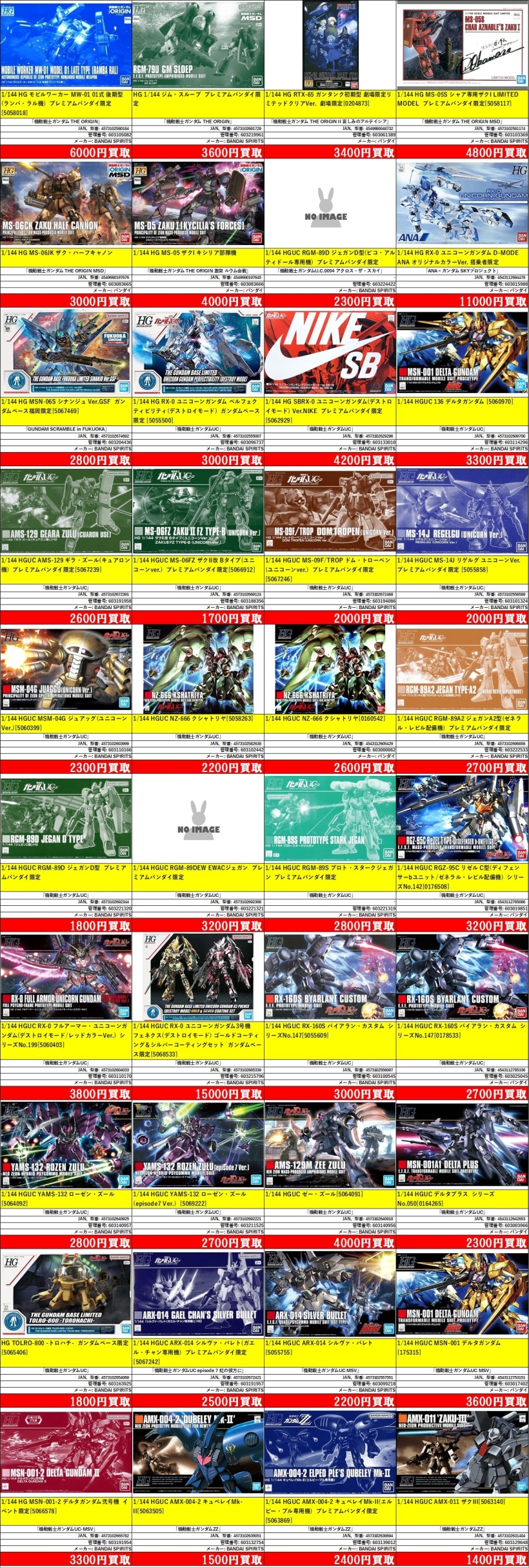 掲載価格は完品美品中袋未開封品の買取価格です。品物の状態、在庫状況や市場価格によって買取価格は変動します。掲載アイテムはあらかじめ分けてお持ち込みください。
