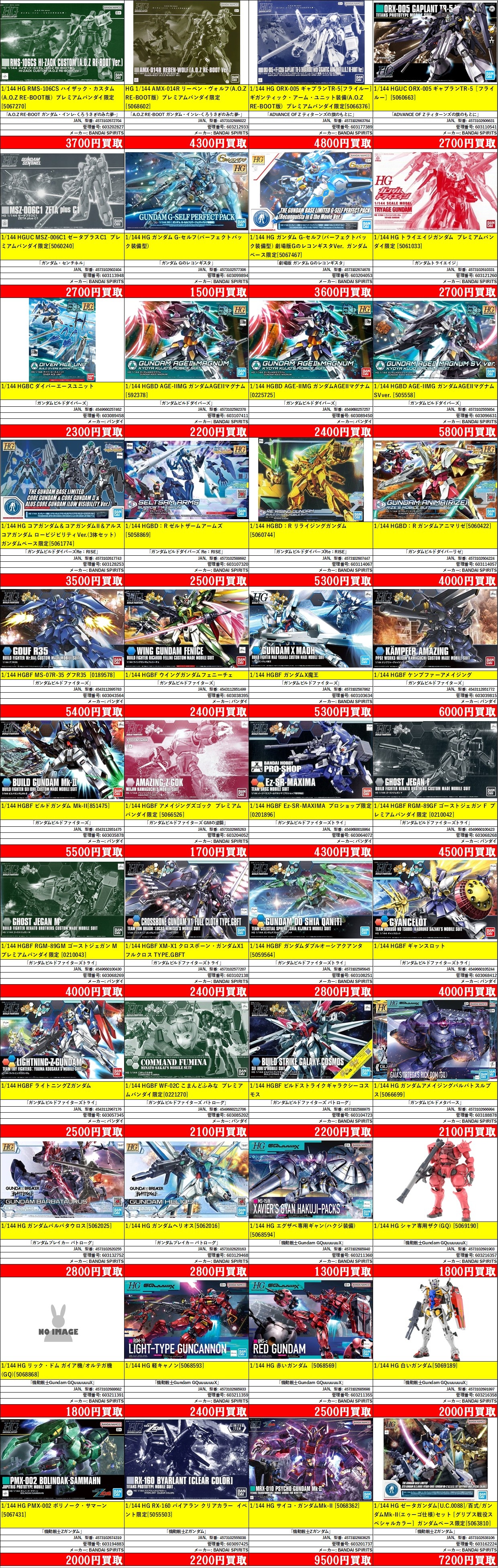 | 603213364 | HG 1/144 ゼータガンダム[U.C.0088](バイオセンサーイメージカラー) ガンダムベース限定 | 「機動戦士Zガンダム」 | [5068536] | BANDAI SPIRITS | 4573102685360 | ¥2,600 |