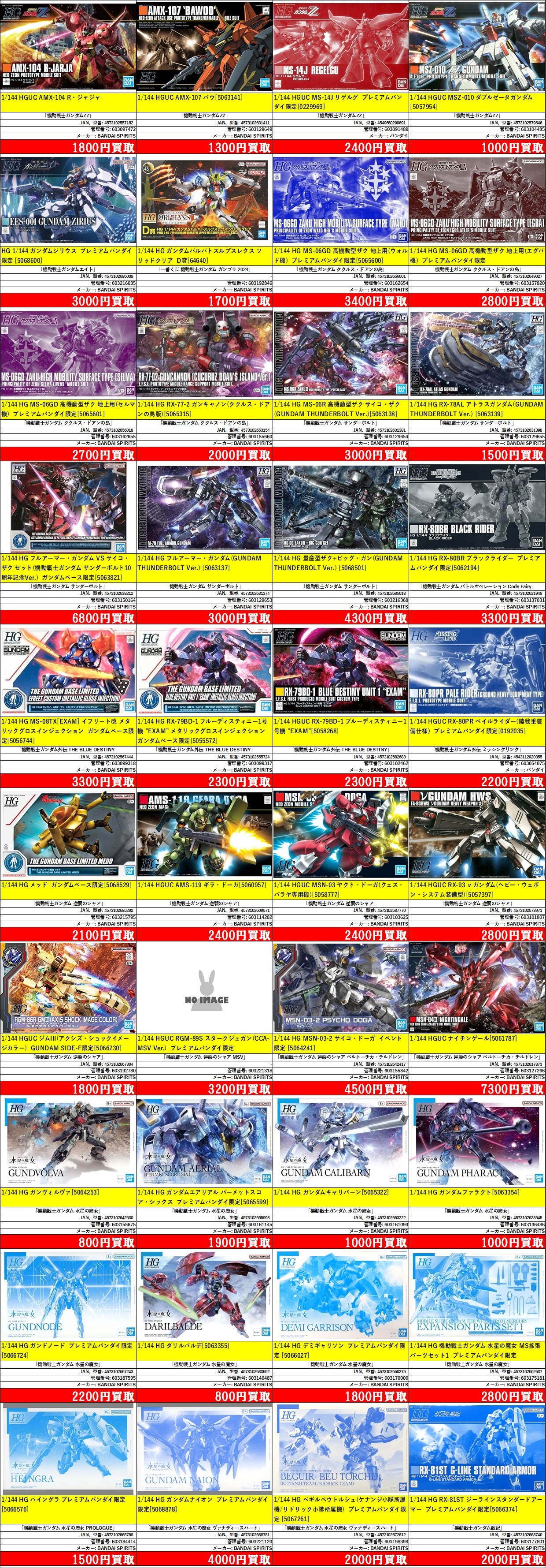 | 603216035 | HG 1/144 ガンダムジリウス プレミアムバンダイ限定 | 「機動戦士ガンダムエイト」 | [5068600] | BANDAI SPIRITS | 4573102686008 | ¥3,000 |