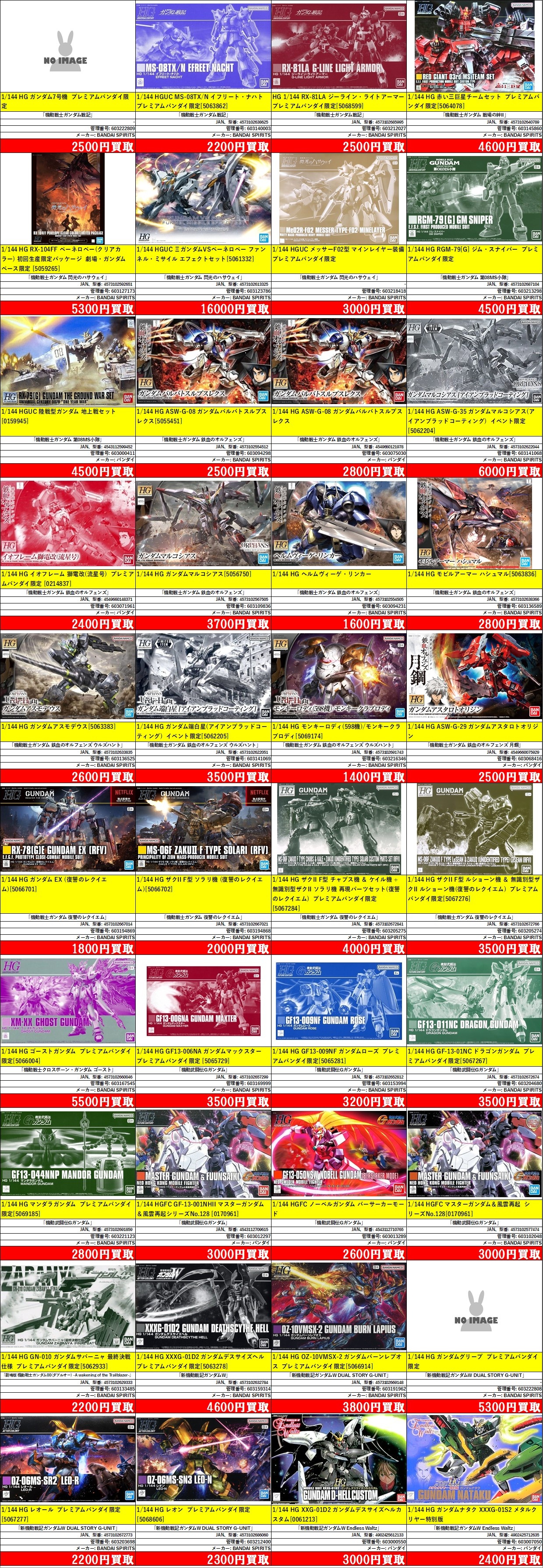 | 603194869 | 1/144 HG ガンダム EX (復讐のレクイエム) | 「機動戦士ガンダム 復讐のレクイエム」 | [5066701] | BANDAI SPIRITS | 4573102667014 | ¥1,800 |