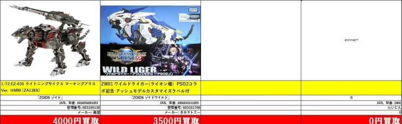 | 603161786 | ZW01 ワイルドライガー(ライオン種) PSO2コラボ記念 アッシュモデルカスタマイズラベル付 | 「ZOIDS ゾイドワイルド」 | [-] | タカラトミー | 4904810111955 | ¥3,500 |