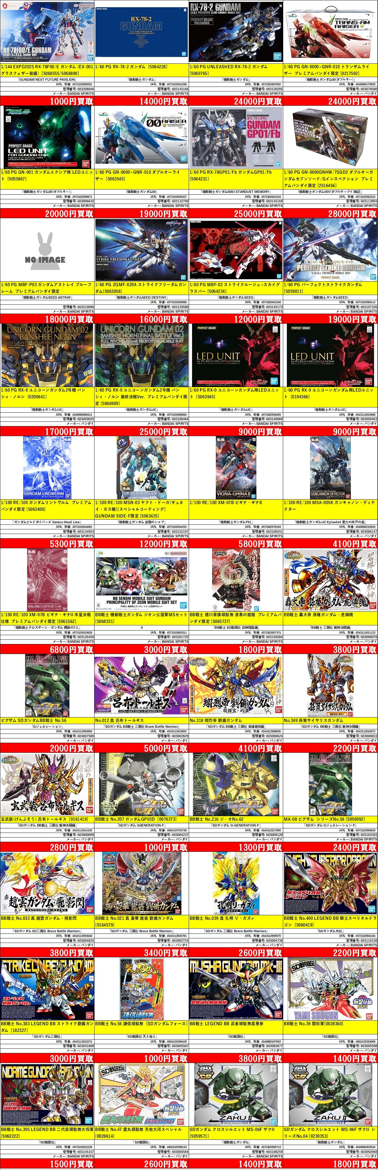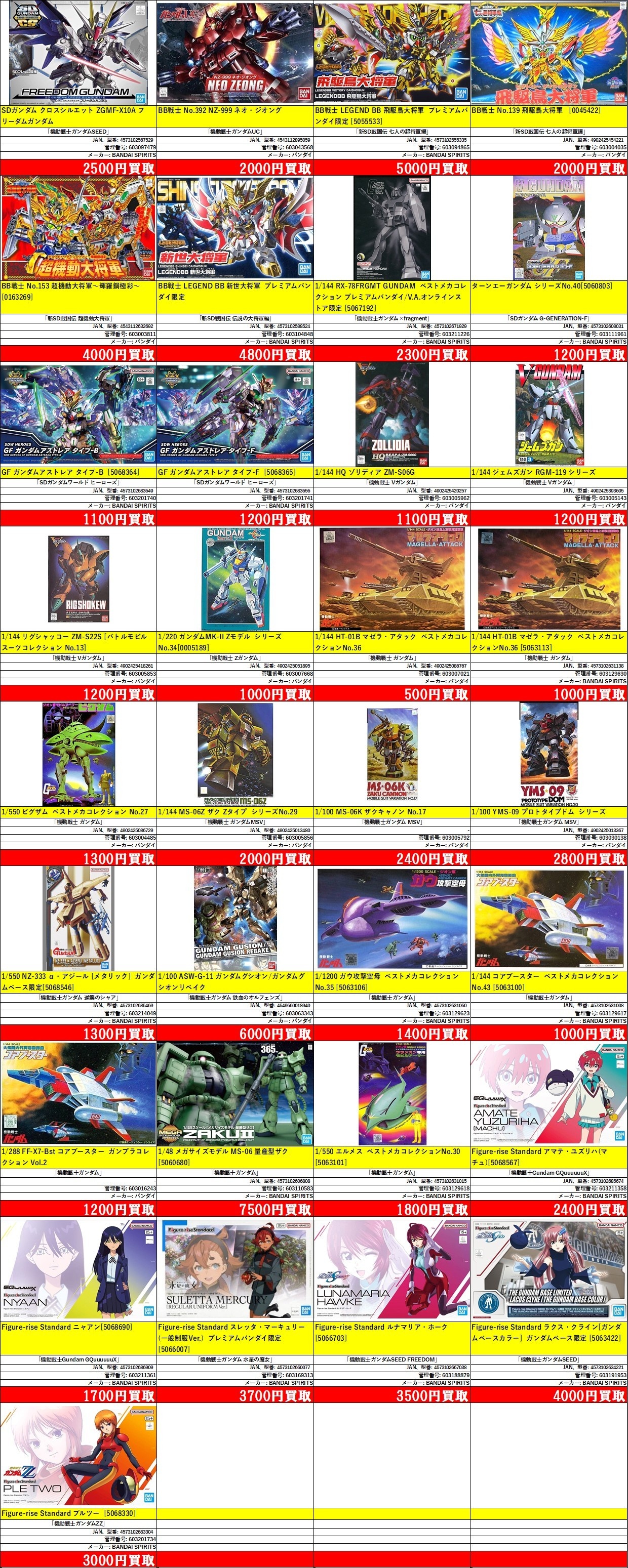 掲載価格は完品美品中袋未開封品の買取価格です。品物の状態、在庫状況や市場価格によって買取価格は変動します。掲載アイテムはあらかじめ分けてお持ち込みください。