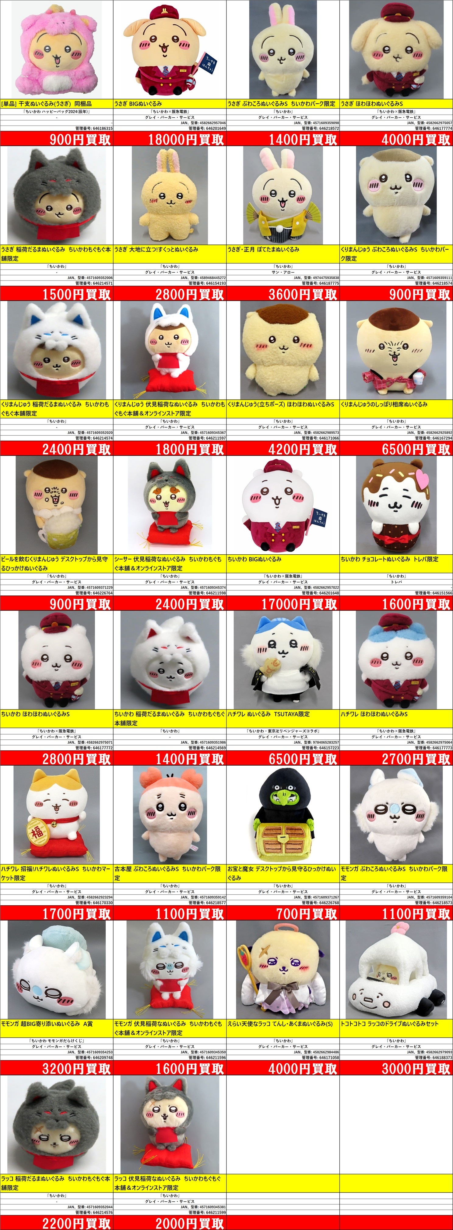 | 646177774 | うさぎ ほわほわぬいぐるみS | 「ちいかわ×阪急電鉄」 | [-] | グレイ・パーカー・サービス | 4582662975057 | ¥4,000 |