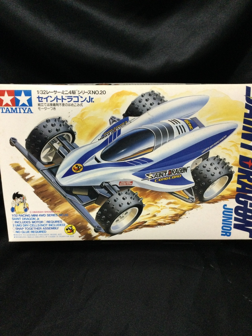 1/32レーサーミニ四駆シリーズNO.14「アバンテJr.」 ITEM 18014 ラジコンでも人気の高かったアバンテのジュニア版ミニ四駆。漫画家こしたてつひろ先生が別冊コロコロコミックスペシャルで連載していた「ミニ四駆RC伝説 燃えろ!アバンテ兄弟」で登場。主人公・兄の翔一はラジコンのアバンテ、弟の風太はミニ四駆のアバンテJr.を愛用していました。ラジコン版は当時小学生の私には手が出ない値段でこちらを所有。RCカー『アバンテ』はカッコよさと値段の高さに衝撃を受けました。 当時タイプ1シャーシしかなかったところ、こちらのアバンテJr.から軽量のタイプ2シャーシが採用された。このタイプ2シャーシが出る前はブーメランJr.やサンダーショットJr.のタイプ1シャーシをドリルで穴開けて軽量化を図るのが、友だち内で流行っていました。ちなみボディの裏側も薄く削ろうとし、カッターで手の首をいった時はだいぶ焦りました。かなり深く今でも跡が残っています。 スリックタイヤもこちらから採用になりました。